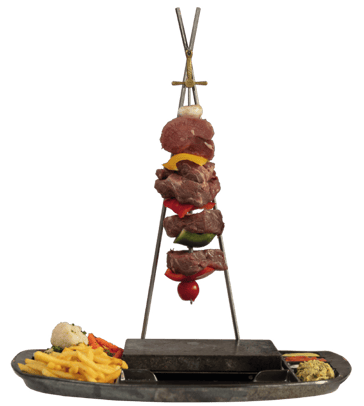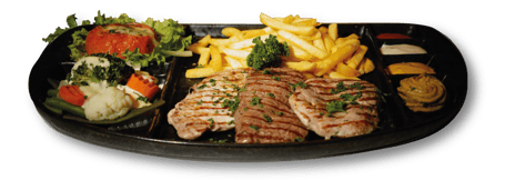 mit Gemüsebeilage, Pommes frites, Kräuterbutter, Curry-, Mexicaine- und Knoblauchsauce